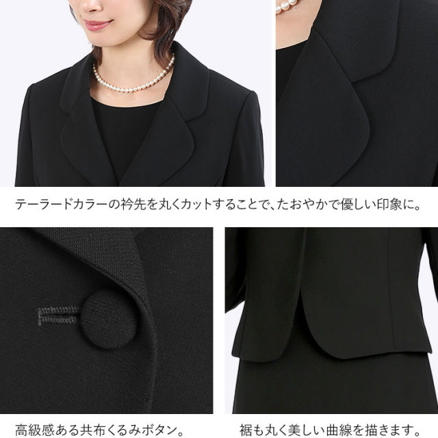 素材・生地にもこだわったオールシーズン対応のブラックフォーマル(喪服・礼服)です。 生地に特殊な表面処理「濃染加工」を施すことで、スーパーブラックと呼ばれる“深い黒”を実現しました。しっとりとした深みのある黒は、しめやかな席に相応しい、高級感ある凛とした佇まいを生み出します。 窮屈になりやすい部分にはゆとりを持たせながらも、すっきりと見えるよう計算して立体縫製を施しました。女性のバストラインやウエストに沿って立体的に身体を包み込む「美」シルエットを実現しています。 ご家庭で気軽に手洗いできて、いつでも洗い立ての着心地で気持ちよく過ごせます。形を整えて乾かした後はアイロンをサッとかけるだけでお手入れOKです。 百貨店で取り扱われている大手ブランドのスーツと同じ工場で縫製しているため、百貨店クラスの商品と同等の品質を実現しています。熟練の職人の手によって丹念に仕立てられ、高いファッション性と永くご愛用いただける品質の高さを兼ね備えたブラックフォーマルが誕生しました。 ■曲線美を取り入れた女性らしいテーラードジャケット テーラードカラーの衿先を丸くカットすることで、たおやかで優しい印象に。 高級感ある共布くるみボタンを使用しています。 裾も衿先と同様の丸いカッティングで美しい曲線を描きます。 袖はスリットで長さを調節可能です。水仕事の際にも手元がすっきりします。 ■愛らしいリボン付きウエストサテンラインワンピース 肘が隠れる七分丈で、袖口がふわりと広がり腕を華奢に見せます。 サイドには念珠などの収納に便利なシームポケット付きです。 前は1枚接ぎ、後ろは2枚接ぎですっきりとしたフレアスカート。 黒塗りの金具を使用した上品な背面コンシールファスナーです。 |