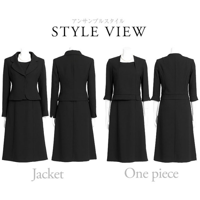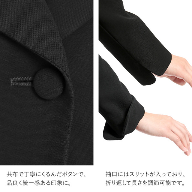 素材・生地にもこだわったオールシーズン対応のブラックフォーマル(喪服・礼服)です。 生地に特殊な表面処理「濃染加工」を施すことで、スーパーブラックと呼ばれる“深い黒”を実現しました。しっとりとした深みのある黒は、しめやかな席に相応しい、高級感ある凛とした佇まいを生み出します。 窮屈になりやすい部分にはゆとりを持たせながらも、すっきりと見えるよう計算して立体縫製を施しました。女性のバストラインやウエストに沿って立体的に身体を包み込む「美」シルエットを実現しています。 百貨店で取り扱われている大手ブランドのスーツと同じ工場で縫製しているため、百貨店クラスの商品と同等の品質を実現しています。熟練の職人の手によって丹念に仕立てられ、高いファッション性と永くご愛用いただける品質の高さを兼ね備えたブラックフォーマルが誕生しました。 ■曲線美を随所に取り入れたテーラードカラーカラージャケット 丸みを帯びたシルエットのラウンディッシュテーラードカラー。衿の先を丸くカットすることでお顔周りを優しい雰囲気に演出します。 共布で丁寧にくるんだボタンで、品良く統一感ある印象に。 袖口にはスリットが入っており、折り返して長さを調節可能です。 ■一枚で着ても上品な2ピース風デザインのワンピース 前身頃のファスナーが大きく開き、一人でも簡単に着脱できます。衿元の生地が二重になっており、生地の下に金具を隠せます。 袖は緩やかなフレアーシルエットの七分袖で、二の腕を自然にカバーします。 |