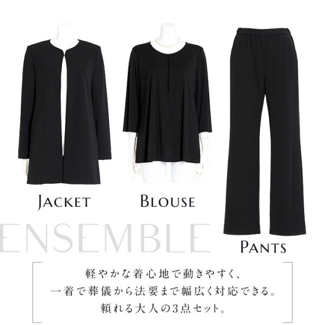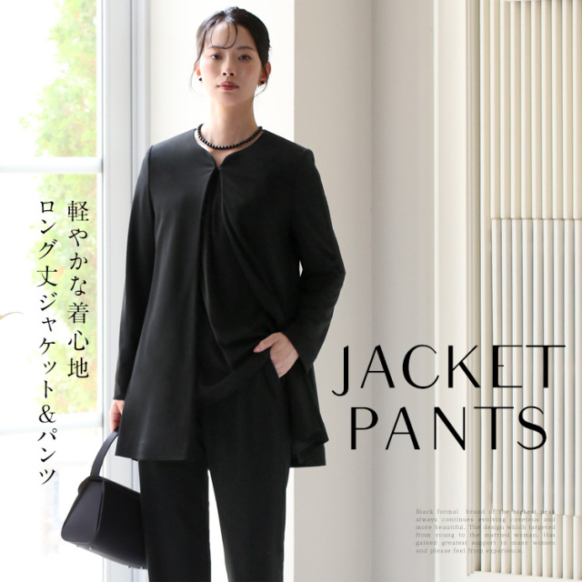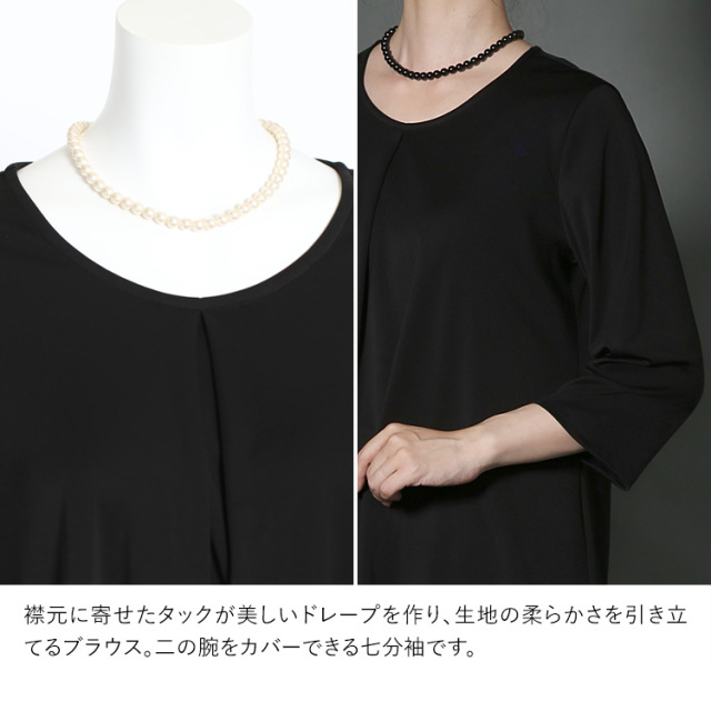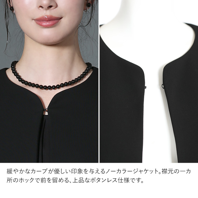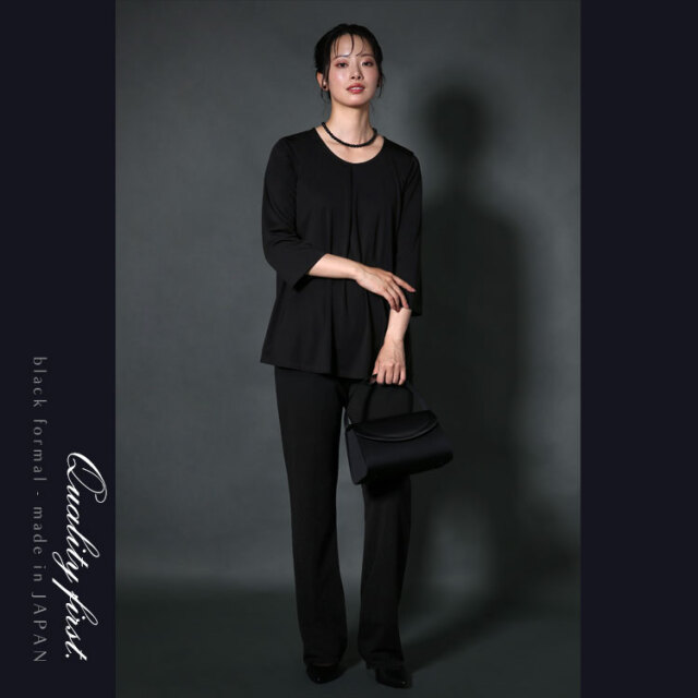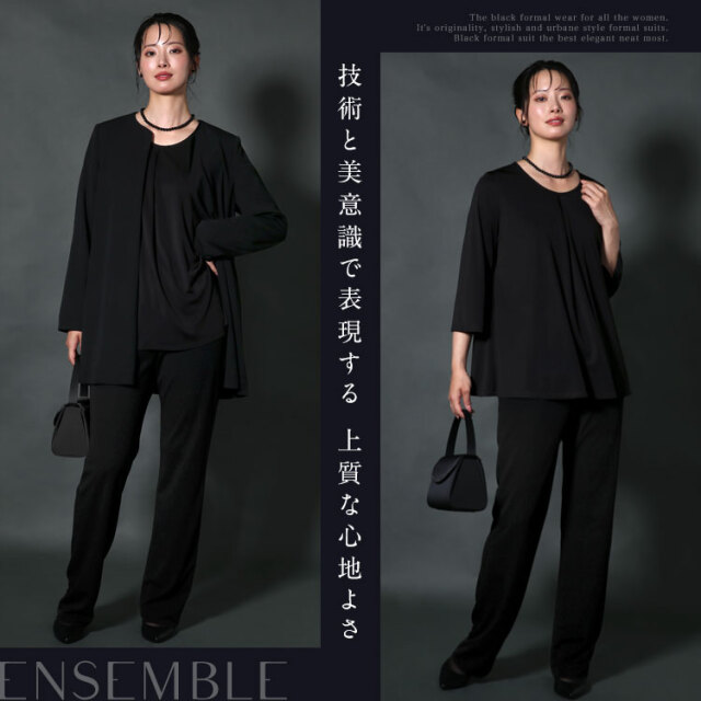 完全日本製の高級感漂うワンランク上のブラックフォーマルです。 厳選した素材と熟練の職人が縫製した妥協のない品質をお届けいたします。 ■並んだときに差が付く極上の黒 厳選した染料や深色剤で光の反射をコントロールする低屈折樹脂加工を施し、より濃く深い黒を表現しております。 ■軽やかな着心地のロング丈ジャケット 緩やかなカーブが優しい印象を与えるノーカラージャケットです。 襟元の一カ所のホックで前を留める、上品なボタンレス仕様です。 お腹とお尻をすっぽり隠して、かがんでも背中が出ないロング丈です。 サイドには小物の収納に便利なシームポケットを施しています。 ■ゆったりとしたストレートパンツ パンツのウエストは全周ゴムギャザー入りで、快適に伸縮します。 サイドには小物の収納に便利なスラッシュポケット付きです。 ・ジャケット&パンツ生地 - “漆黒”の洗える生地「ゼログ」 ふっくらとしたソフトで上質な肌ざわり、ストレッチ性が高くシワになりにくい高機能生地です。ご自宅で手洗いできて、いつでも清潔に着用できます。 ■夏場の法要もサマになるエレガントなブラウス 襟元に寄せたタックが美しいドレープを作り、生地の柔らかさを引き立てるブラウスです。 二の腕をカバーできる七分袖です。 ・ブラウス生地 - “漆黒”の洗えるトリアセテート生地 ニット織のブラウス生地はストレッチ性があり、静電気が起きにくく、肌に優しい着心地です。ご自宅で手洗いできて、いつでも清潔に着用できます。 |