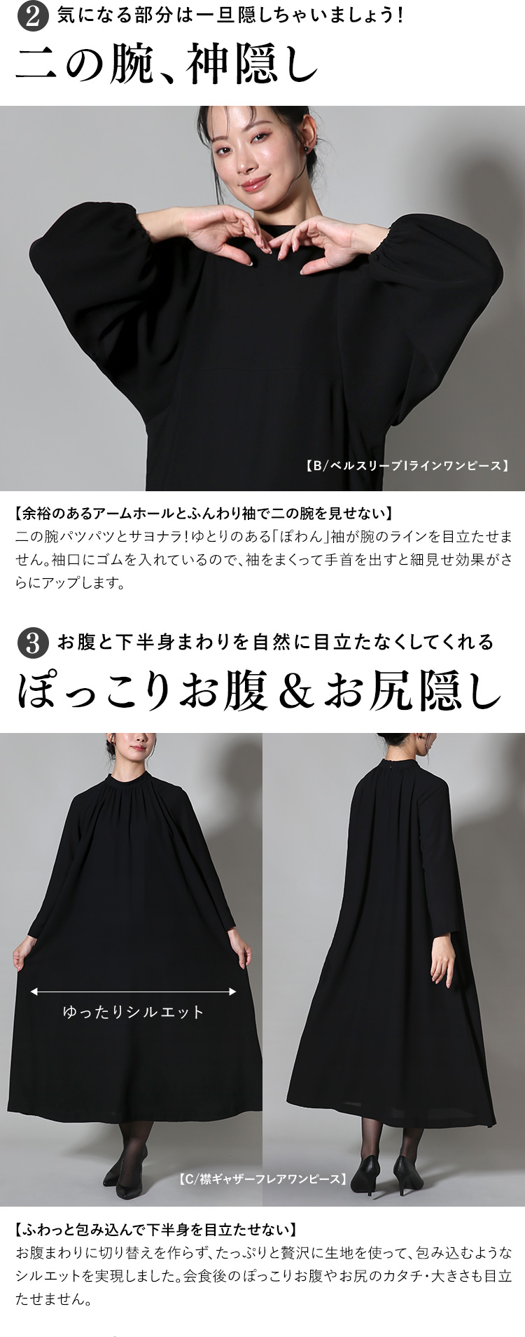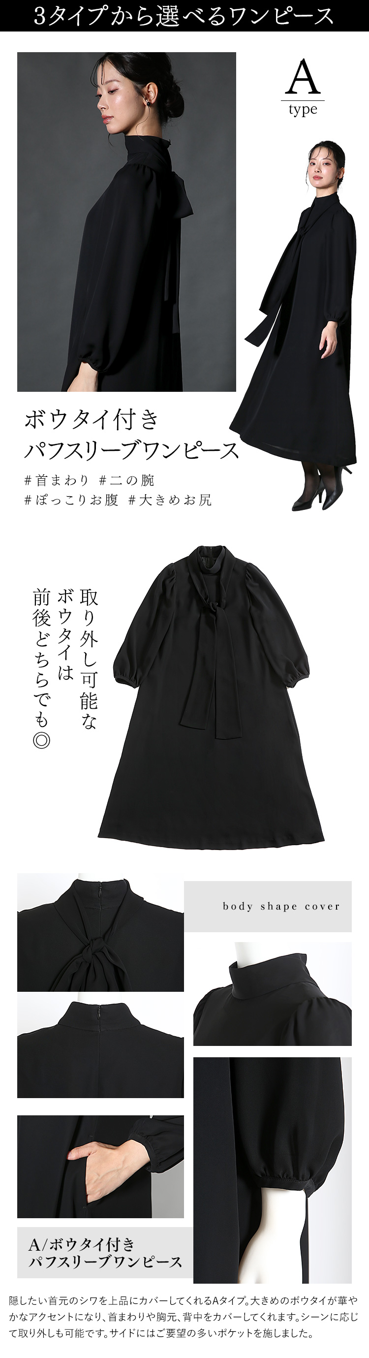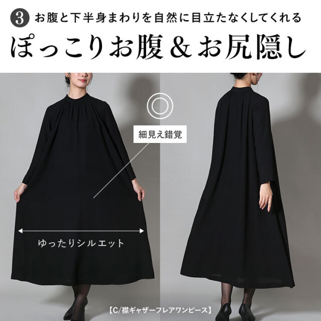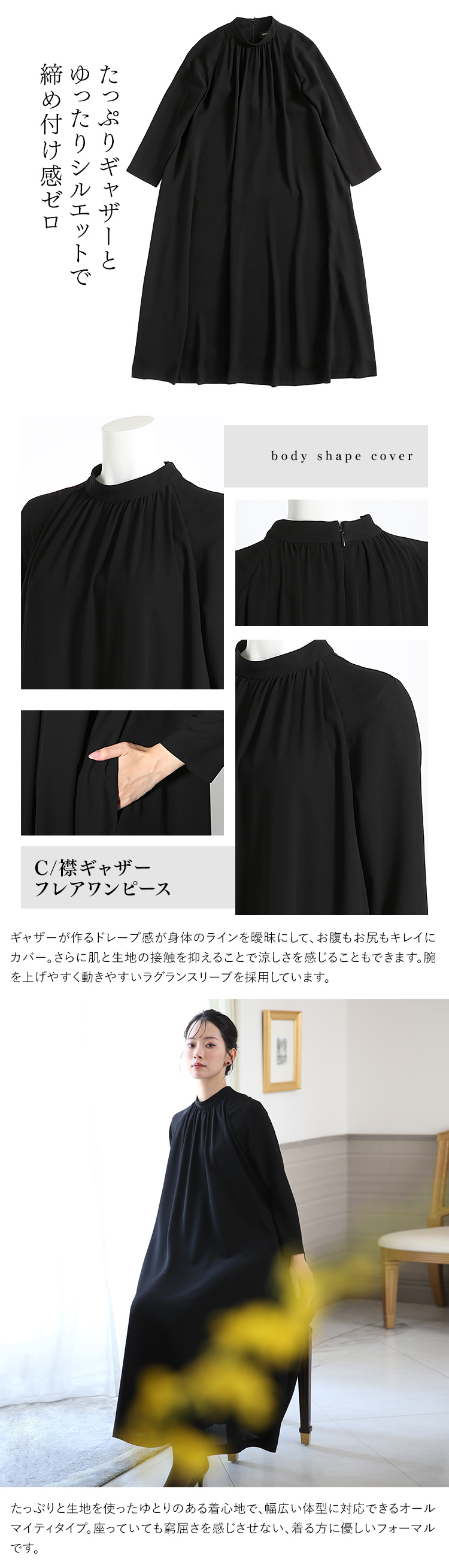 | デザイン | ノーカラー ワンピース 体型カバー ロング丈 |