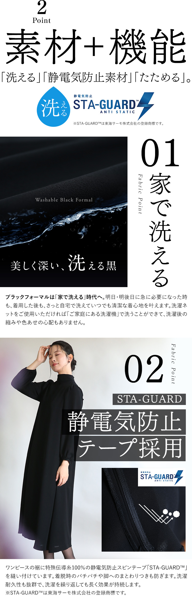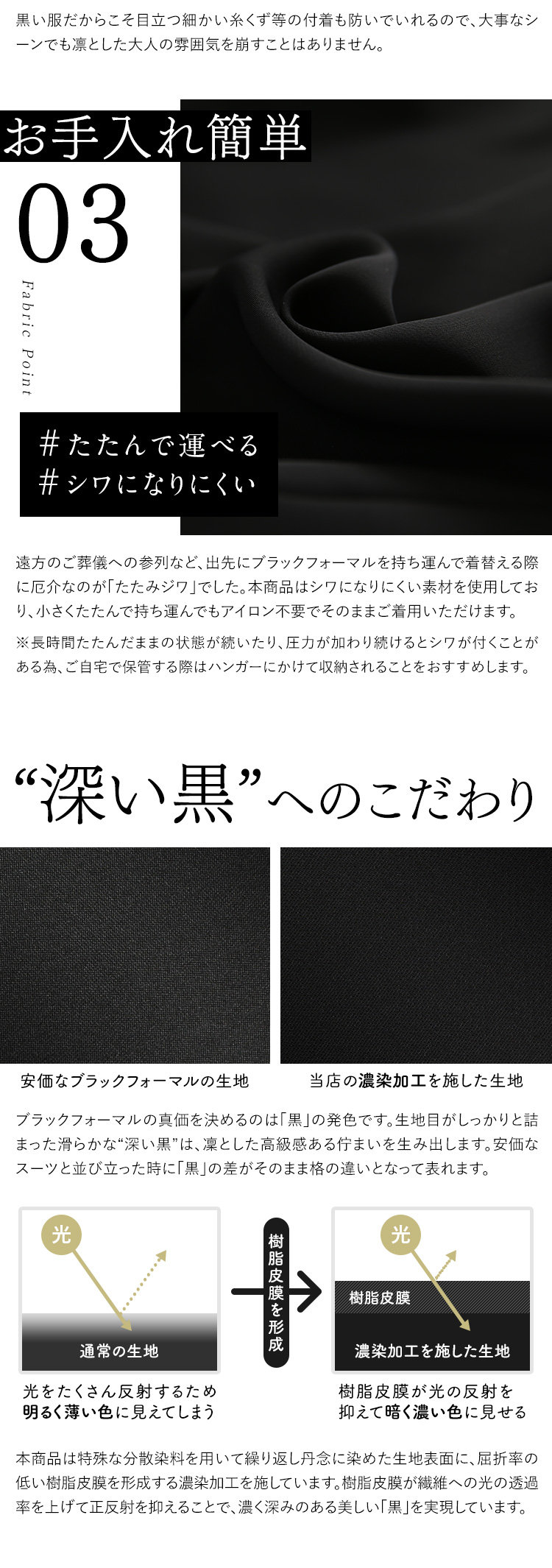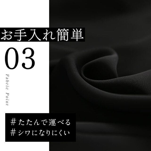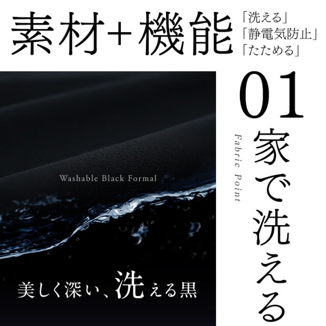 素材・生地にもこだわったブラックフォーマル(喪服・礼服)です。 生地に特殊な表面処理「濃染加工」を施すことで、スーパーブラックと呼ばれる“深い黒”を実現しました。しっとりとした深みのある黒は、しめやかな席に相応しい、高級感ある凛とした佇まいを生み出します。 ご家庭で気軽に手洗いできて、いつでも洗い立ての着心地で気持ちよく過ごせます。形を整えて乾かした後はアイロンをサッとかけるだけでお手入れOKです。 百貨店で取り扱われている大手ブランドのスーツと同じ工場で縫製しているため、百貨店クラスの商品と同等の品質を実現しています。熟練の職人の手によって丹念に仕立てられ、高いファッション性と永くご愛用いただける品質の高さを兼ね備えたブラックフォーマルが誕生しました。 |